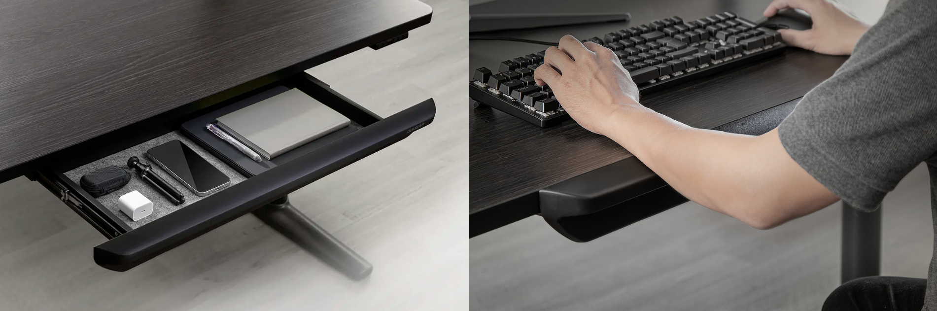 Un reposabrazos en el borde del escritorio evita las molestias causadas por los bordes afilados. Funciona también como cajón con un volumen de 62 x 26 x 5 cm, lo que ayuda a mantener el espacio de trabajo limpio y organizado, con fácil acceso a los accesorios.