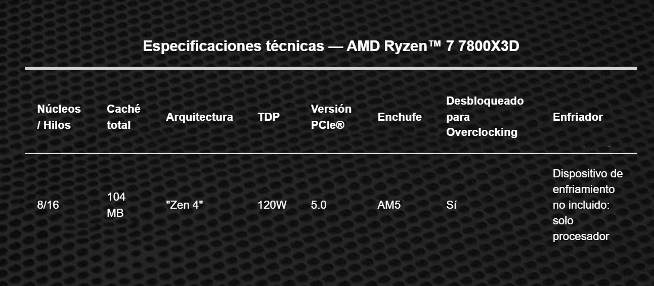 El procesador AMD Ryzen™ 7 7800X3D con tecnología AMD 3D V-Cache™ ofrece un rendimiento de juego absoluto que supera las más altas expectativas.