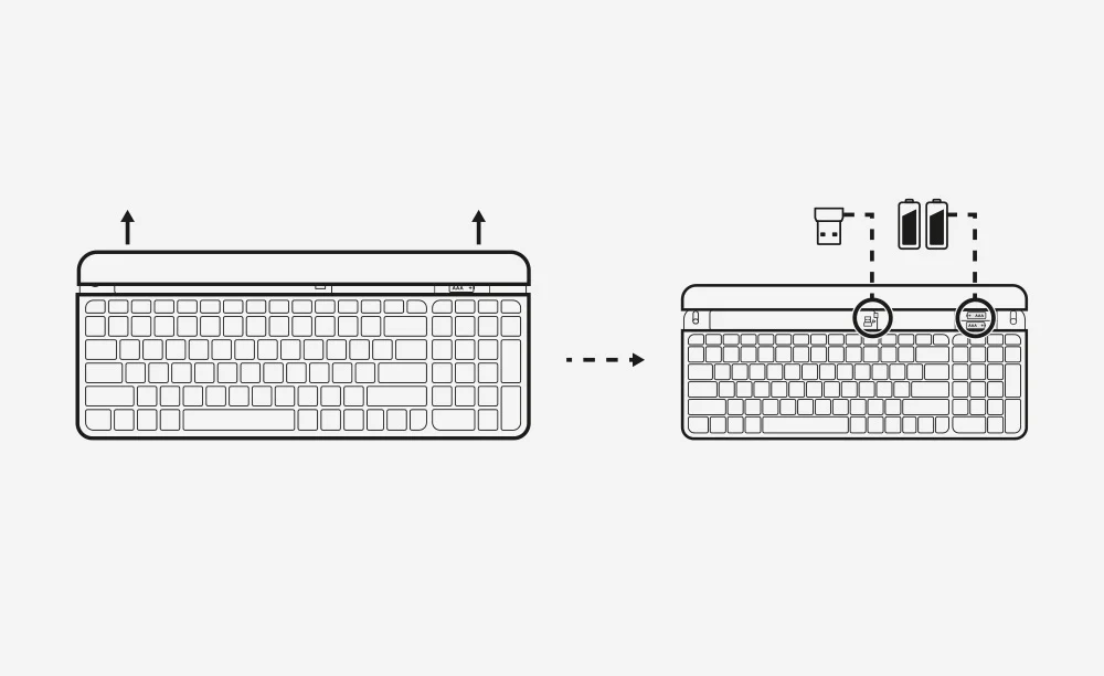 Desliza la parte superior del teclado hacia arriba para acceder al compartimento de las baterías y el receptor.