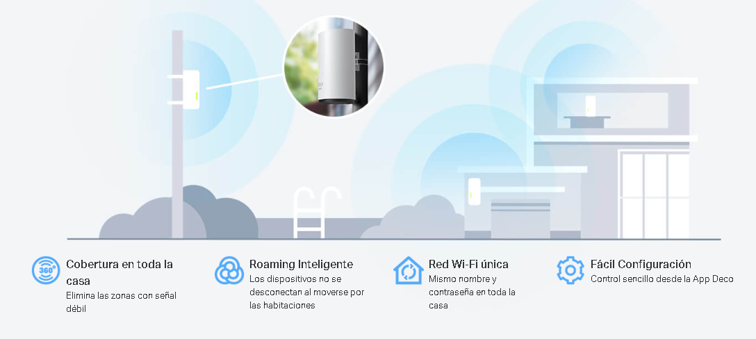Todas las unidades Deco trabajan juntas para formar una única red bajo un mismo nombre y contraseña. Tu móvil, tablet o consola se conecta automáticamente a la unidad Deco que mejor señal pueda ofrecer a medida que te mueves por la casa.