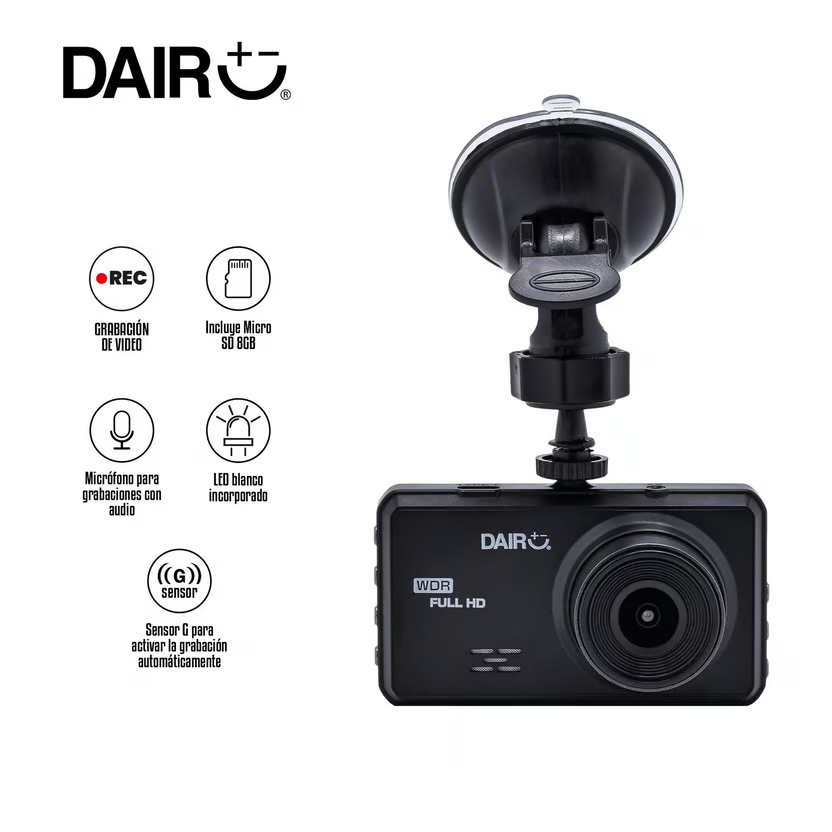 Incluye MicroSD de 8 GB para 4 días de grabación continua aproximadamente, Incluye vetosa de succión y soporte para la cámara, fácil montaje en vidrios panorámicos de carro, Pantalla de 3\, Funciones:Grabación de vídeo, Captura de fotografías, Reproducción de archivos capturados en la cámara, Almacenamiento: Admite Tarjeta Micro SD de hasta 32 GB, Grabación en bucle sin cortes ni interrupciones con duración ajustable, LED blanco incorporado que se activa automáticamente para mejorar la visión en la noche, automático, Micrófono integrado para tener grabaciones con audio