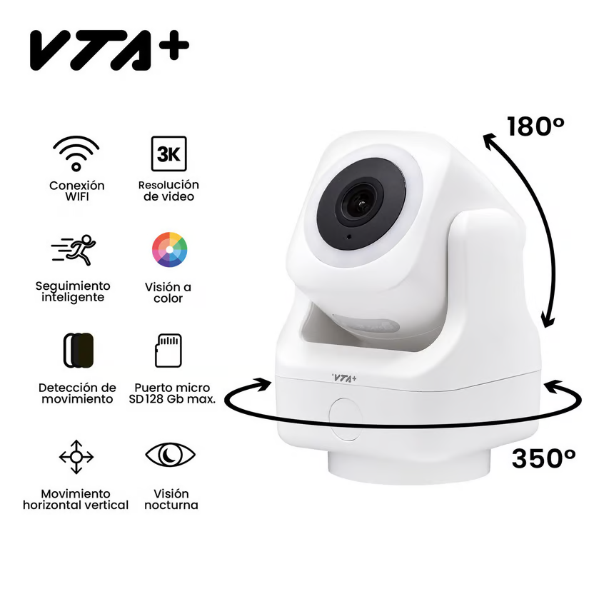Protege tu hogar o negocio con la Cámara Inteligente VTA+ Blok 3K, diseñada para ofrecer calidad de imagen en alta resolución 3K y funcionalidad inteligente. Con su capacidad de rotación, puedes monitorear cada rincón de tu espacio, asegurando que nada pase desapercibido.