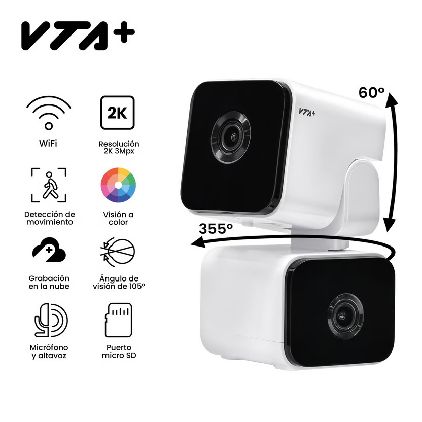 Protege tu hogar u oficina con la Cámara de Seguridad VTA+ 2K, diseñada para brindarte una vigilancia completa con calidad 2K (3MPx) y conectividad WiFi. Gracias a su visión panorámica de 360° (rotación de 355° y ajuste vertical de 60°), no perderás detalle de lo que ocurre en cualquier rincón.
