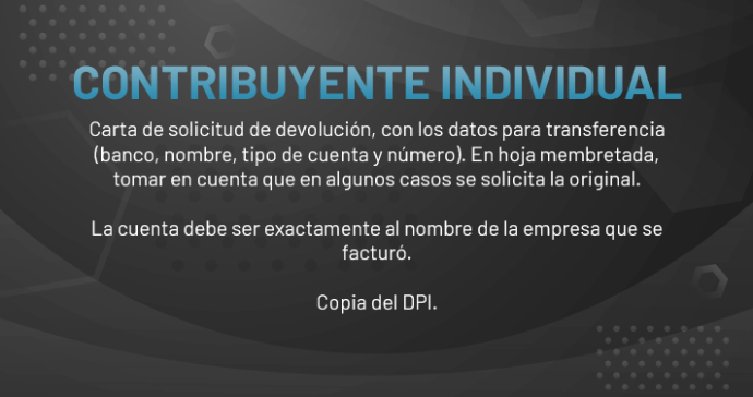 Toda devolución se realiza mediante transferencia bancaria a nombre del titular de la factura. Para montos iguales o superiores a Q50,000.00 la devolución se efectúa mediante cheque.