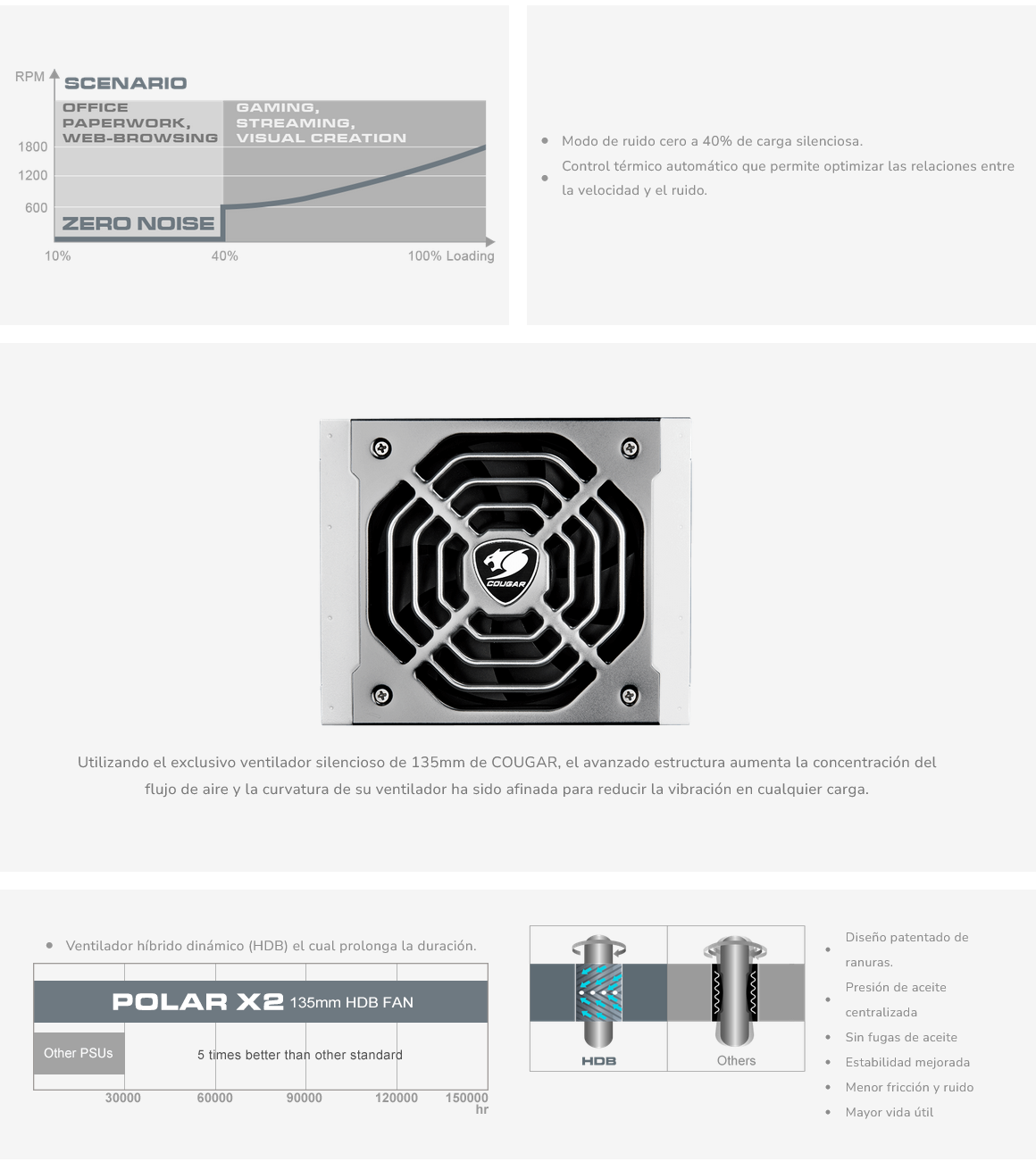 COUGAR presentará la serie de fuentes de alimentación ATX 3.1 de eficiencia Platinum, POLAR X2 1200 y 1050. Los capacitores 100% japoneses y el funcionamiento a 50°C con estructura LLC, DC-DC generan una PSU ecológica de rendimiento de alta eficiencia. El ventilador HDB de ajuste fino con modo de ruido cero también ofrece la experiencia perfecta para todos los usuarios en diferentes condiciones.