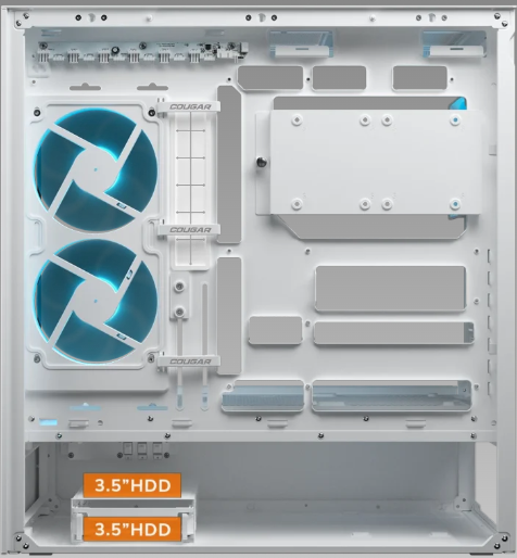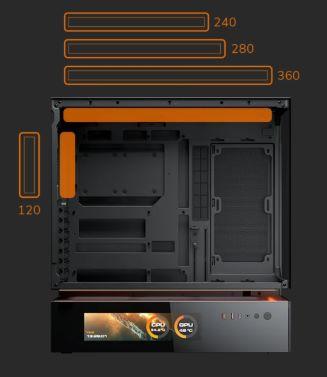 El CFV235 Vision tiene una capacidad de ventilador de 3x120mm o 3x140mm en la parte superior, 3x120mm en el suelo de la cámara principal, 2 ventiladores de 120mm en la placa base y 1x120mm (preinstalado) en la parte trasera. El soporte de refrigeración líquida alcanza un máximo de 360 mm en la parte superior.