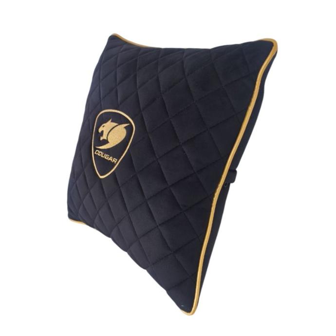 Diseño gamer con logo y acentos dorados para combinar con sillas y setups en negro/dorado de Cougar u otras marcas. Recomendado para sesiones largas de gaming o teletrabajo, como apoyo lumbar o como cojín de asiento más suave sobre sillas gamer o de oficina.