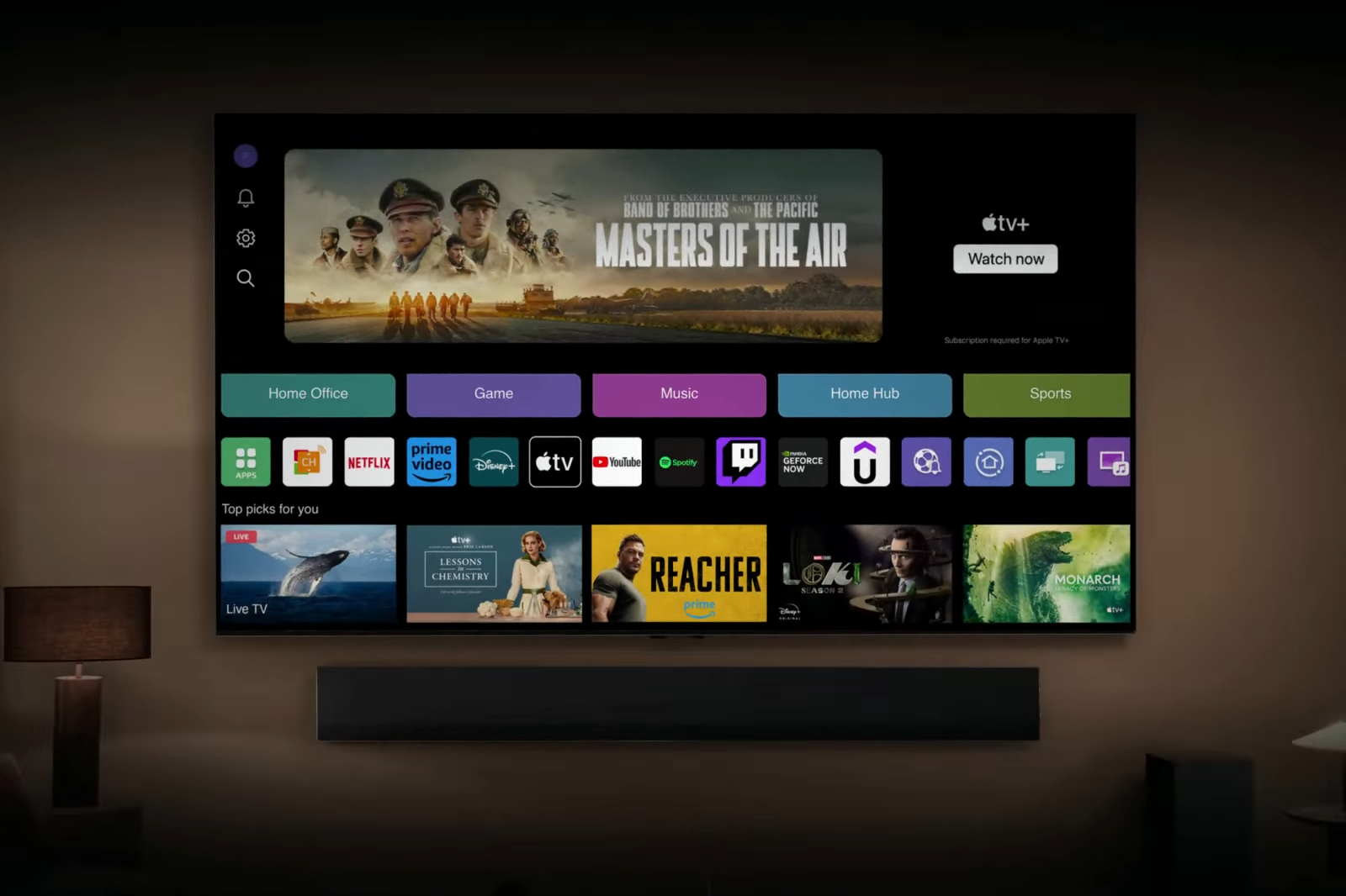 El sistema de sonido detecta cómo está distribuida tu habitación y dónde estás sentado para crear un sonido envolvente a tu alrededor, adaptado perfectamente a la acústica única de tu espacio. Por ejemplo, si estás viendo una película desde el sofá, el sistema ajustará el sonido para que te sientas inmerso en la acción, sin importar dónde estés sentado.