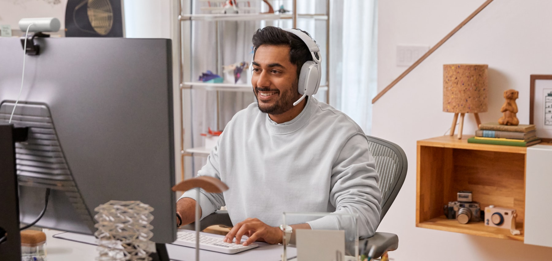 Trabaja desde casa sin perder el ritmo. La compatibilidad con las plataformas populares de reuniones y llamadas facilita la incorporación en cualquier reunión. Un micrófono con cancelación de ruido que se voltea para silenciar minimiza los sonidos de fondo para que te puedan escuchar con claridad.