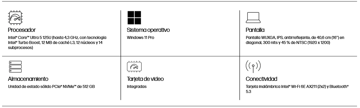 - Procesador Intel Core Ultra 5 125U@ 1.3GHz base