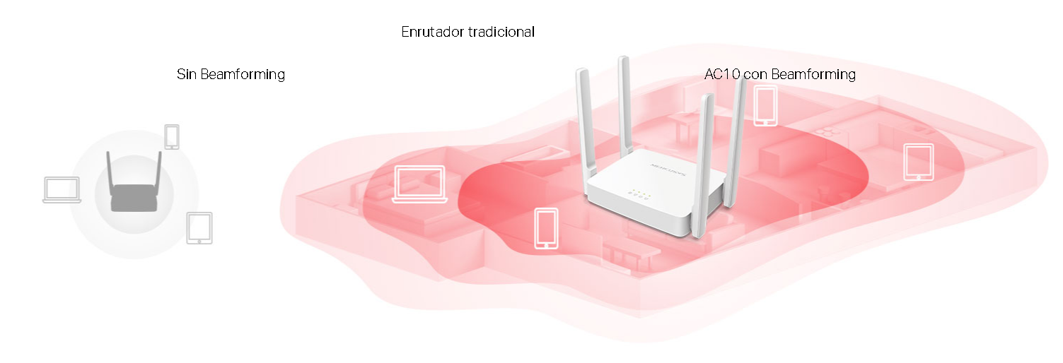 Cuatro antenas externas de 5dBi alimentadas con tecnología de antena avanzada brindan a los usuarios una mayor cobertura inalámbrica en su hogar u oficina. Con la combinación de la tecnología Beamforming, el AC10 puede detectar la ubicación de sus dispositivos conectados y concentrar la fuerza de la señal inalámbrica hacia ellos, haciendo que su conexión sea más estable.