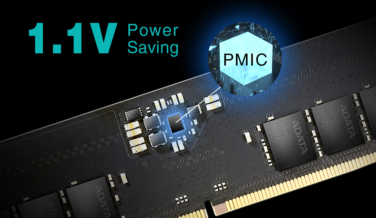 Este módulo de memoria de próxima generación funciona con solo 1,1 V, lo que lo hace un 8% más energéticamente eficiente que DDR4. Además, cuenta con un IC de administración de energía (PMIC) integrado para mejorar la estabilidad de la fuente de alimentación.