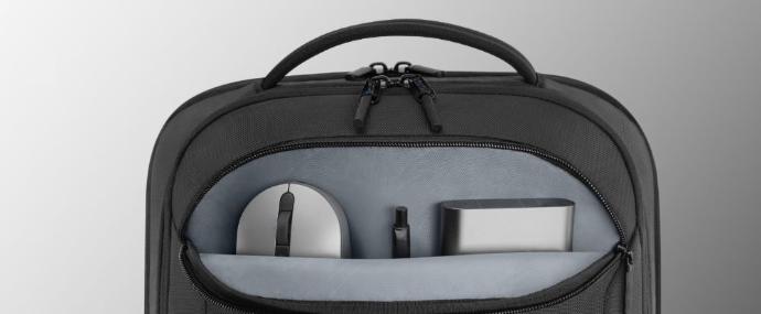 La etiqueta Dell EcoLoop™ identifica productos fabricados con materiales y/o procesos seleccionados que ayudan a reducir el impacto ambiental en comparación con los métodos tradicionales de la industria. La mochila incluye los siguientes objetos: