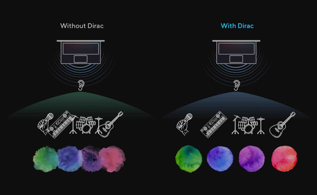Este sistema de audio, diseñado con la ayuda de los expertos en audio de Dirac (proveedor de soluciones de audio profesional), ofrece la experiencia de sonido más envolvente, clara y equilibrada que jamás hayas escuchado en un ordenador, portátil o tablet. Escucharás un paisaje sonoro más amplio y profundo de lo que podrías imaginar, para liberar todo el potencial de audio del portátil.