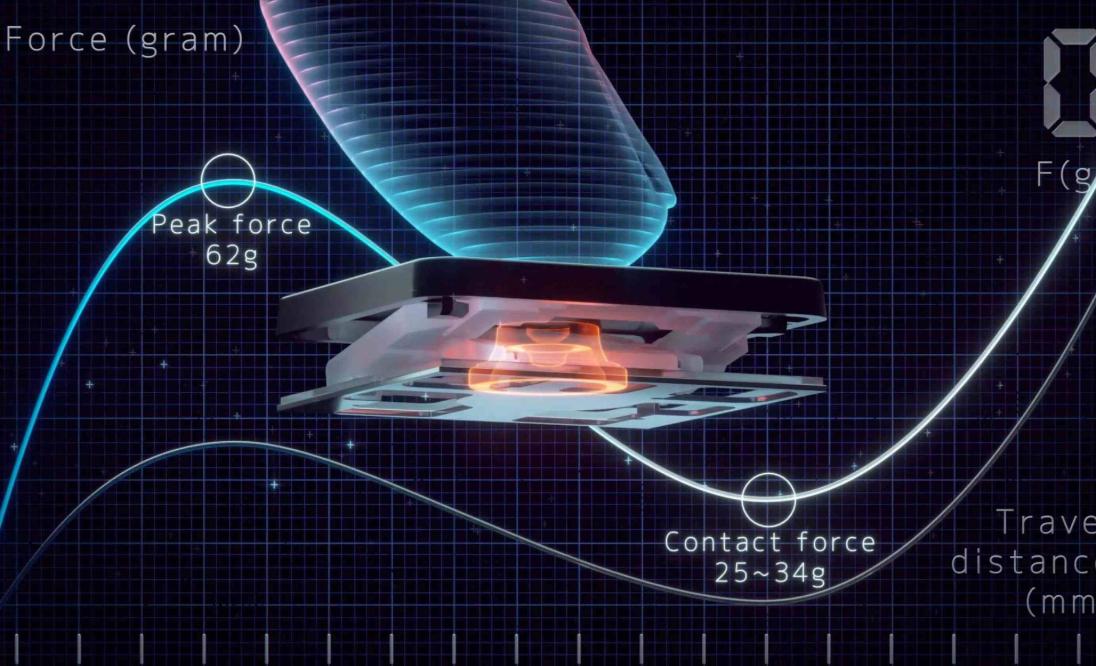 El tacto de un teclado depende de la relación crucial entre la fuerza máxima (también conocida como fuerza de accionamiento) y la fuerza de contacto. La fuerza máxima se produce cuando se presiona la tecla y se alcanza la fuerza máxima que la cúpula de goma de la tecla puede soportar sin desviarse. La fuerza de contacto se produce cuando la parte inferior de la tecla toca la placa de circuitos para activar una señal electrónica, que a su vez genera la acción adecuada a la tecla. Para conseguir la sensación más natural de un teclado, los expertos en teclados de ASUS han determinado científicamente que la relación de clic ergonómica óptima para una tecla se sitúa entre el 45 y el 60 %. Estas fuerzas se miden y ajustan con precisión mediante las cúpulas de goma diseñadas por ASUS bajo las teclas.
