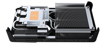 La placa de cobre contacta directamente con la GPU, junto con los tubos de calor de cobre compuesto, que transfieren rápidamente el calor de la GPU y la VRAM al disipador.