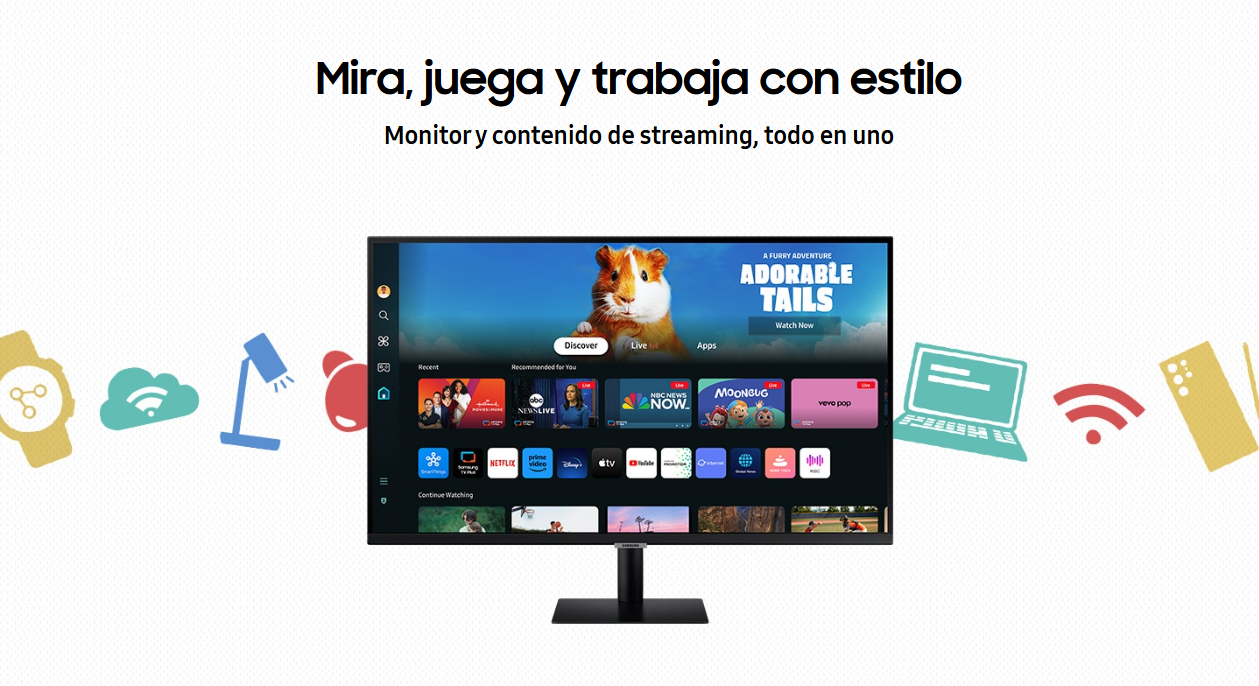¿Tienes que sacarle el mayor provecho a un espacio pequeño, o simplemente quieres una segunda pantalla? Un Smart Monitor M5 es tu mejor opción. Disfruta contenido OTT directamente en tu monitor o sintoniza Samsung TV Plus para ver canales de televisión en vivo y contenido bajo pedido sin costo alguno.