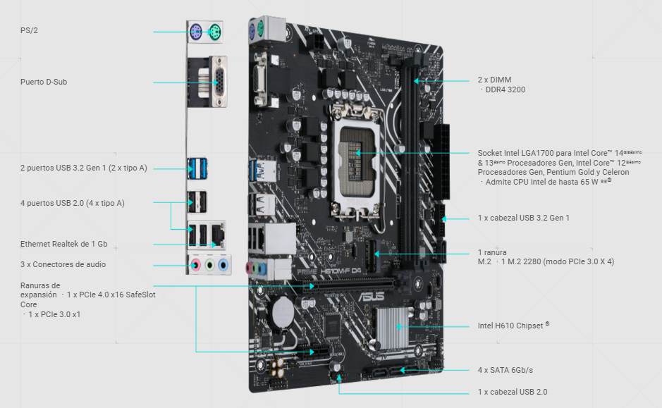 PRIME H610M-F D4Motherboard ASUS PRIME H610M-F D4 Socket LGA1700 14th, 13th y 12th Gen 2xDDR4 mATX