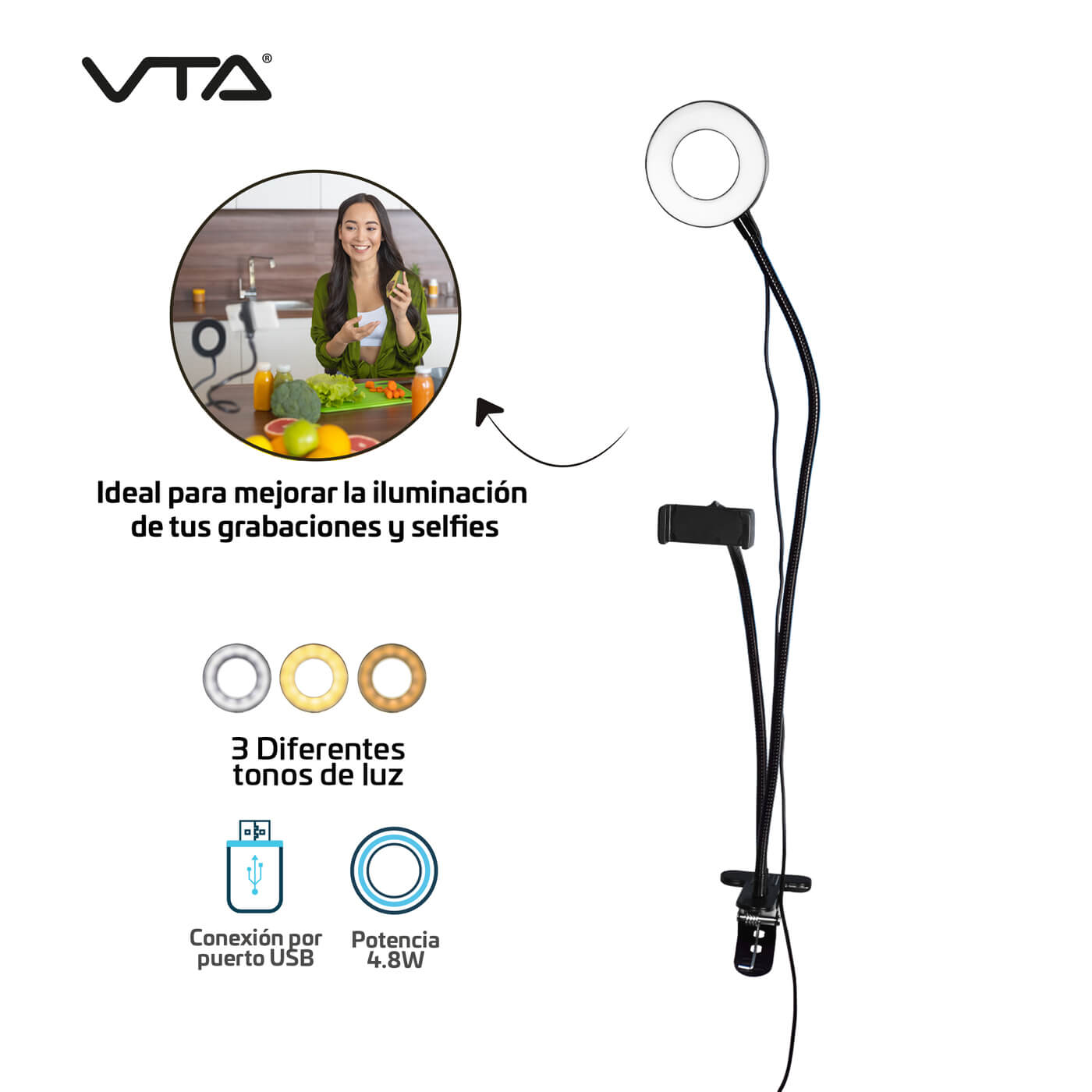 VTA-82731Aro de Luz VTA+ con Soporte Ajustable para Celular USB Negro