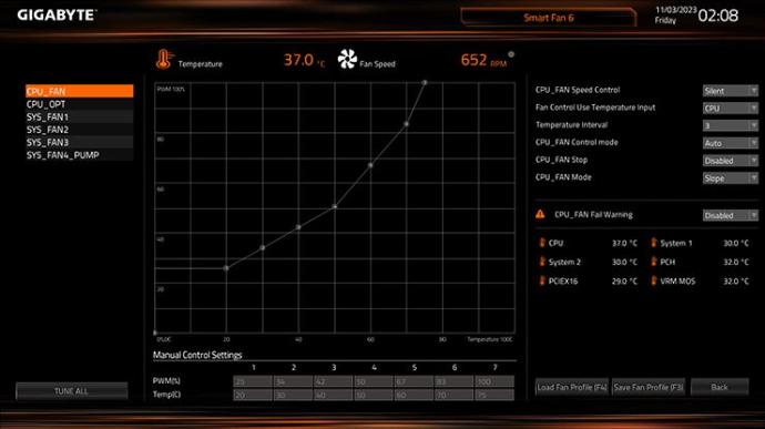 - Afinación EZ: Simplifica el proceso con EZ Tuning estableciendo 4 puntos en una escala aproximada de temperatura/velocidad del ventilador. Smart Fan 6 generará rápidamente una curva de ventilador basada en estos puntos.
