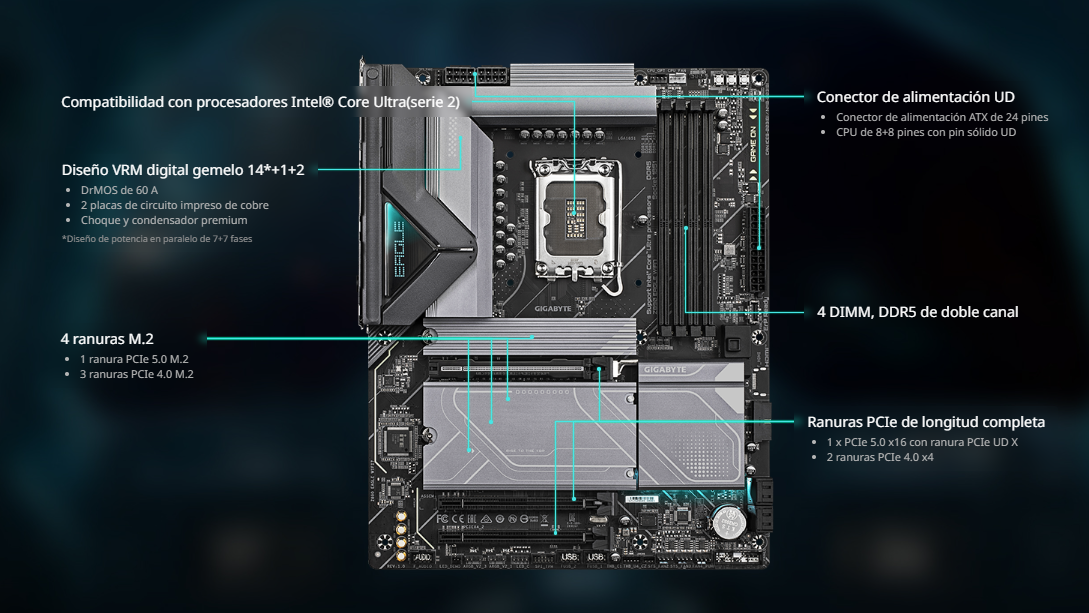 - Ranura PCIe UD X : ranura PCIe 5.0 x16 con potencia 10X para tarjeta gráfica